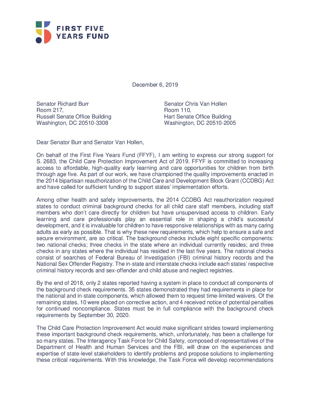 On behalf of the First Five Years Fund (FFYF), I am writing to express our strong support for S. 2683, the Child Care Protection Improvement Act of 2019. FFYF is committed to increasing access to affordable, high-quality early learning and care opportunities for children from birth through age five. As part of our work, we have championed the quality improvements enacted in the 2014 bipartisan reauthorization of the Child Care and Development Block Grant (CCDBG) Act and have called for sufficient funding to support states’ implementation efforts.