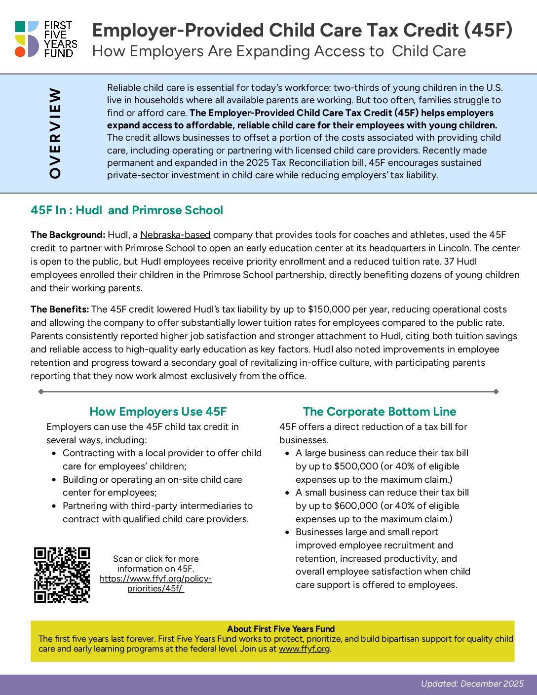 Reliable child care is essential for today’s workforce: two-thirds of young children in the U.S. live in households where all available parents are working. But too often, families struggle to find or afford care. One tool that can help address this challenge is the Employer-Provided Child Care Credit, known as 45F, which was recently permanently expanded, making it even easier for businesses to support working parents.