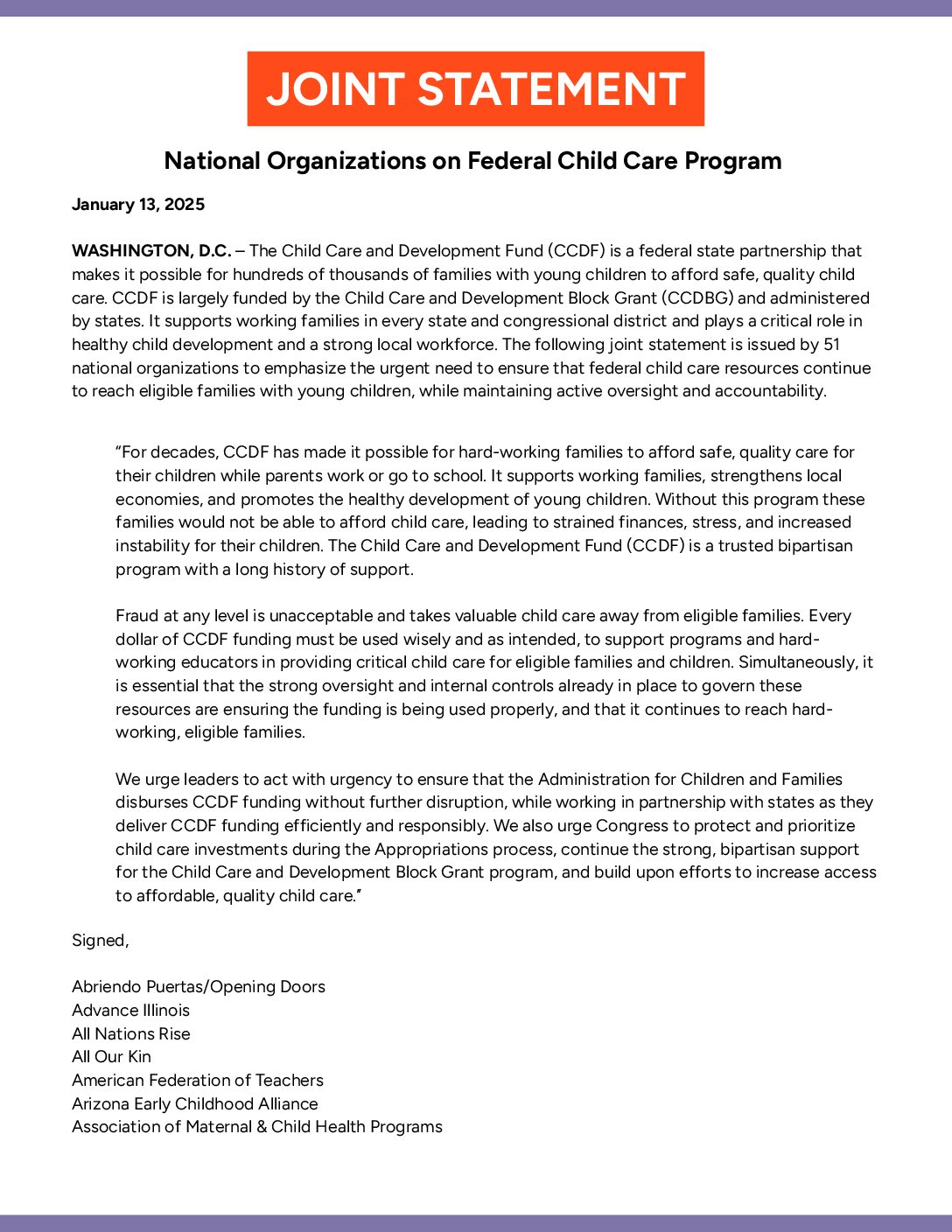 JOINT STATEMENT: National Organizations on Federal Child Care Program