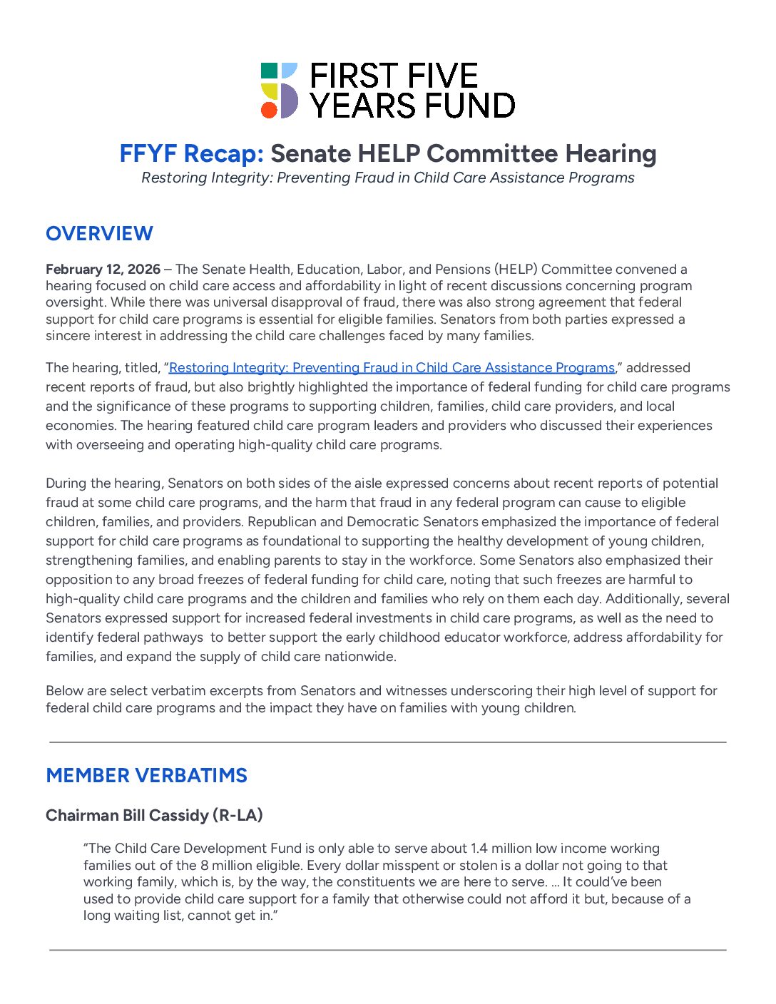 During the hearing, Senators on both sides of the aisle expressed concerns about recent reports of potential fraud at some child care programs, and the harm that fraud in any federal program can cause to eligible children, families, and providers. Republican and Democratic Senators emphasized the importance of federal support for child care programs as foundational to supporting the healthy development of young children, strengthening families, and enabling parents to stay in the workforce. Some Senators also emphasized their opposition to any broad freezes of federal funding for child care, noting that such freezes are harmful to high-quality child care programs and the children and families who rely on them each day. Additionally, several Senators expressed support for increased federal investments in child care programs, as well as the need to identify federal pathways to better support the early childhood educator workforce, address affordability for families, and expand the supply of child care nationwide.