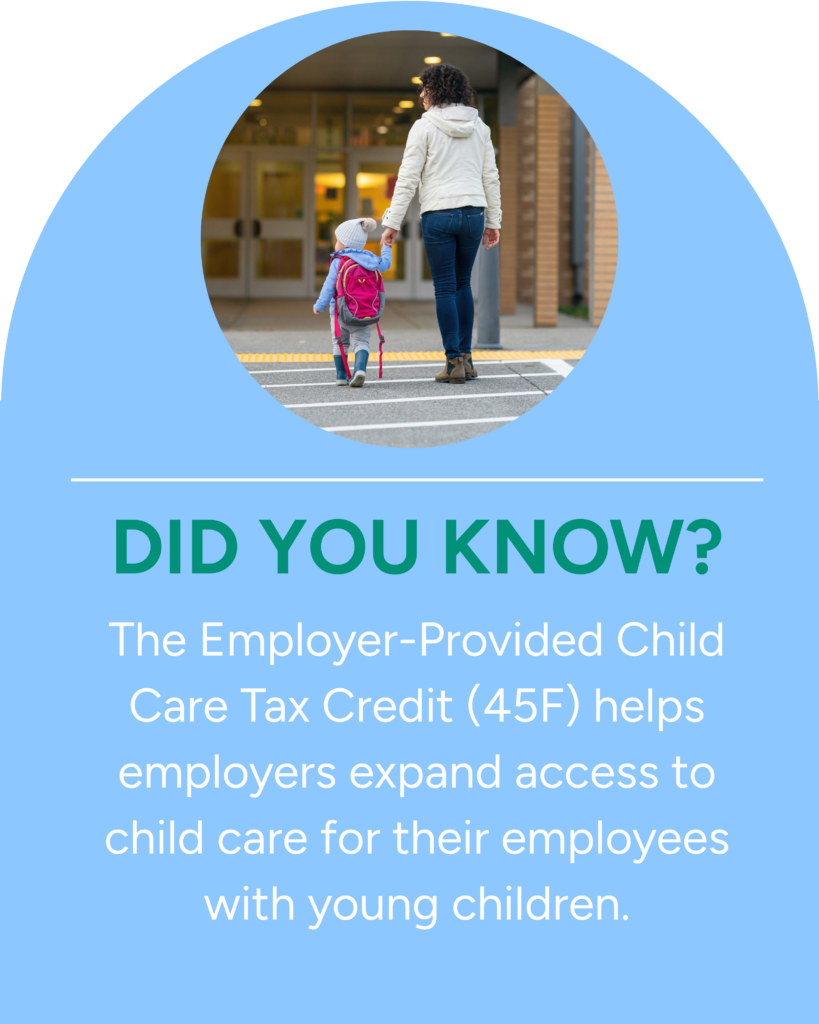 - The Employer-Provided Child Care Credit (known as 45F) supports businesses who want to locate or provide child care for their workforce, while also increasing the number of child care slots available in their community.