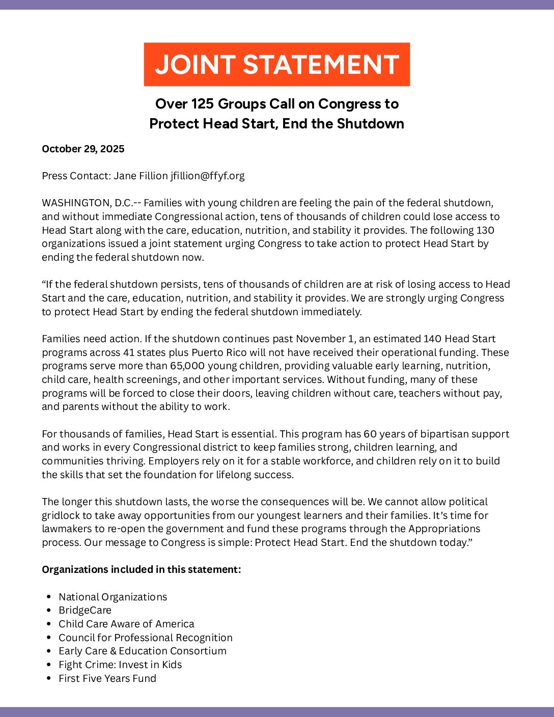 JOINT STATEMENT: Groups Call on Congress to Protect Head Start, End the Shutdown