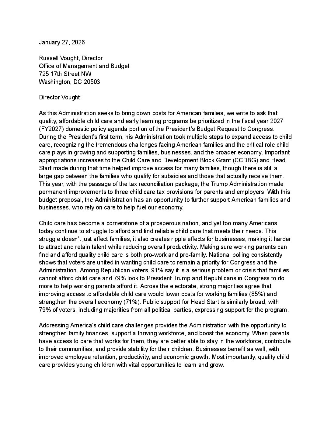 “Addressing America’s child care challenges provides the Administration with the opportunity to strengthen family finances, support a thriving workforce, and boost the economy. When parents have access to care that works for them, they are better able to stay in the workforce, contribute to their communities, and provide stability for their children. Businesses benefit as well, with improved employee retention, productivity, and economic growth. Most importantly, quality child care provides young children with vital opportunities to learn and grow. As you craft the FY2027 Presidential budget, we urge you to continue to prioritize investments in child care solutions essential to families, businesses, and the President’s economic agenda by prioritizing programs like the CCDBG and Head Start.”