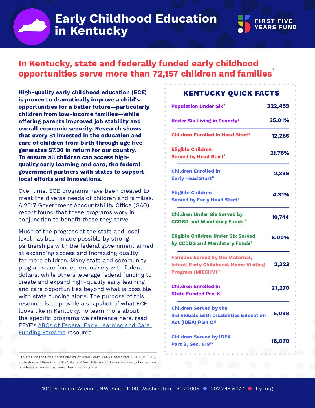 High-quality early childhood education is proven to dramatically improve a child’s opportunities for a better future—particularly children from low-income families—while offering parents improved job stability and overall economic security. To ensure all children can access high-quality early learning and care, the federal government partners with states to support local efforts and innovation. This fact sheet provides an abbreviated overview of state- and federally-funded early childhood opportunities in Kentucky, which serve more than 72,157 children and families.