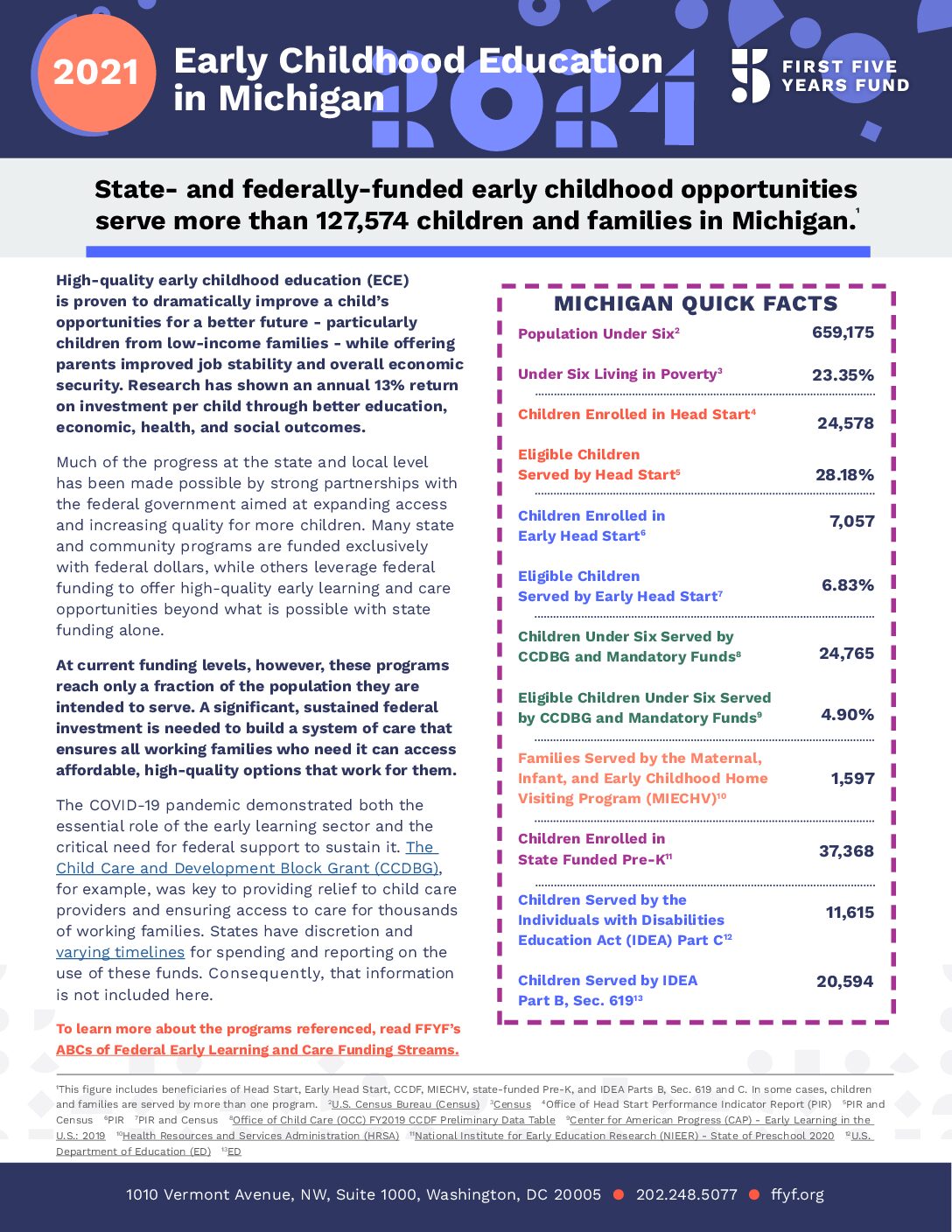 Learn more about the early learning and care landscape in Michigan from the fact sheets linked below. First Five Years Fund has compiled this information to;