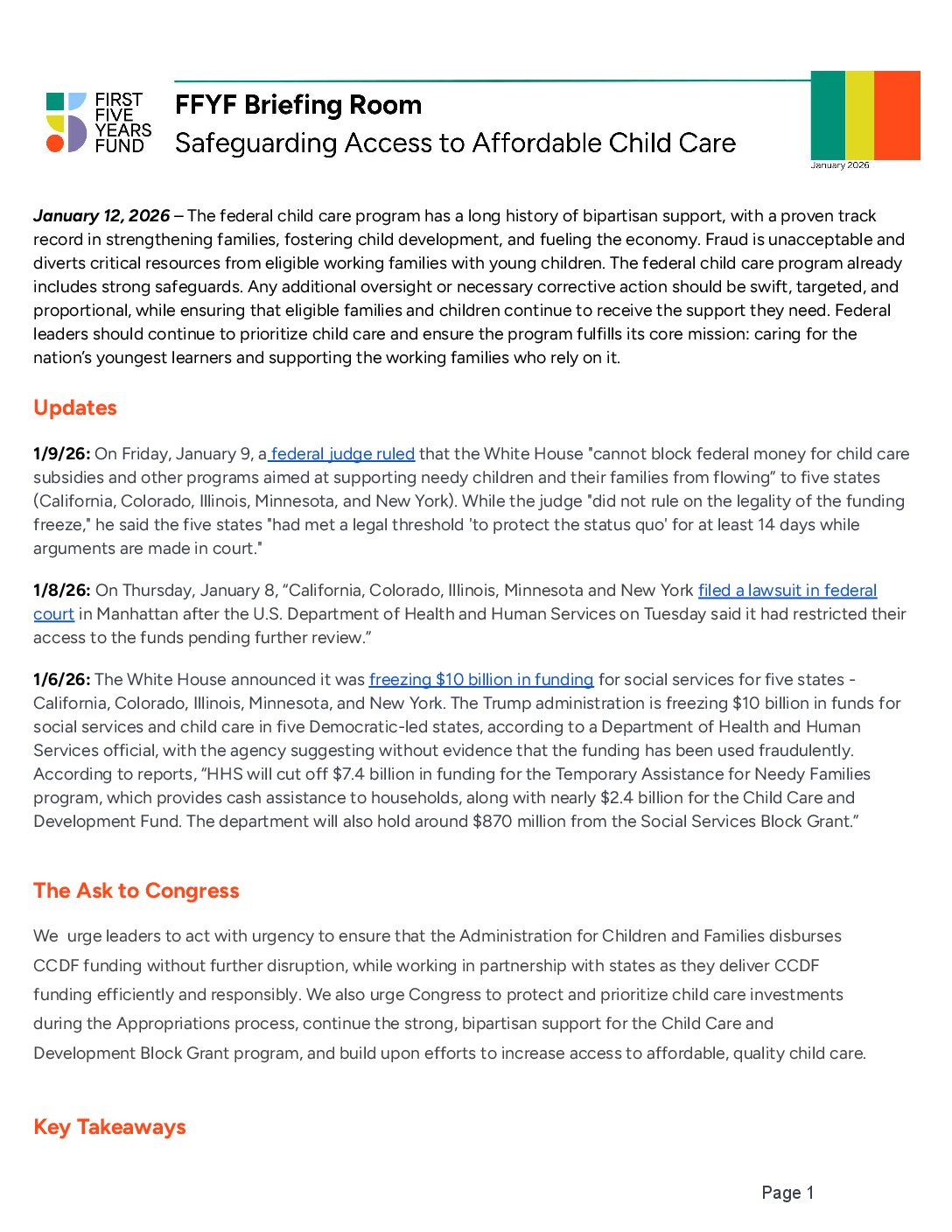 1/9/26: On Friday, January 9, a federal judge ruled that the White House “cannot block federal money for child care subsidies and other programs aimed at supporting needy children and their families from flowing” to five states (California, Colorado, Illinois, Minnesota, and New York). While the judge “did not rule on the legality of the funding freeze,” he said the five states “had met a legal threshold ‘to protect the status quo’ for at least 14 days while arguments are made in court.”