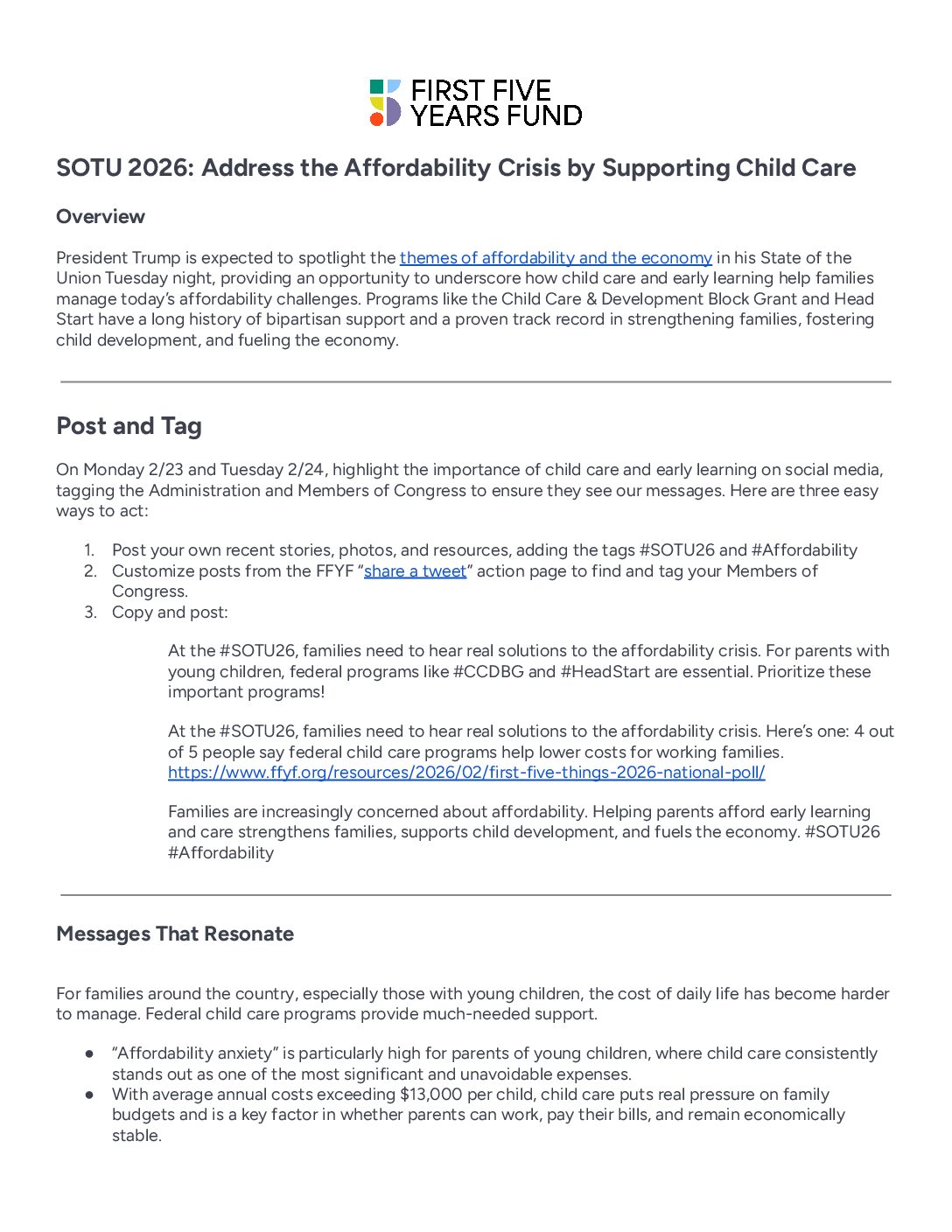 At the #SOTU26, families need to hear real solutions to the affordability crisis. Here’s one: 4 out of 5 people say federal child care programs help lower costs for working families. https://www.ffyf.org/resources/2026/02/first-five-things-2026-national-poll/